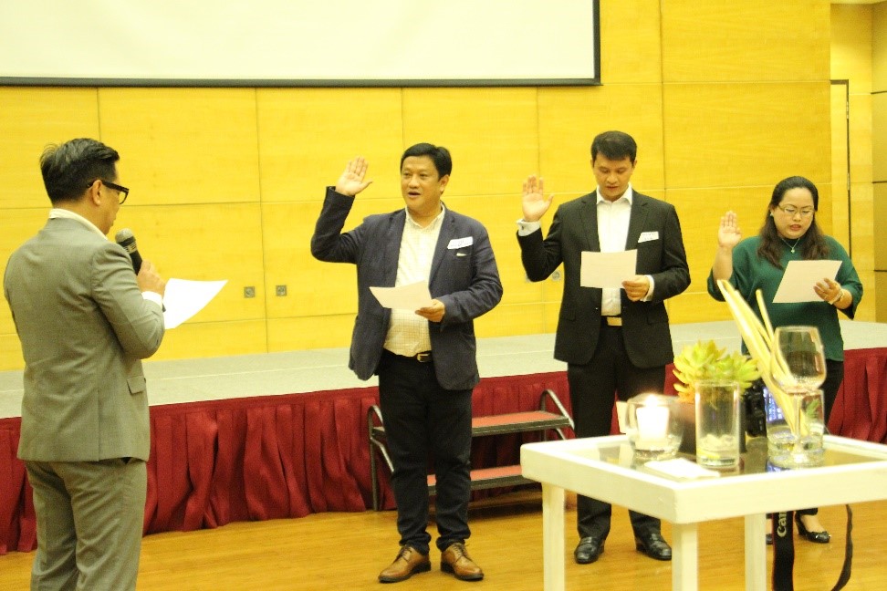 - The Induction and Oath-taking of Officers of the Philippines Chapter was administered by Outgoing Philippines Chapter President Lyndon Paul Daz (MPM 2005), followed by a Message by the Incoming Chapter President Angelo Jimenez, outlining his vision of a more engaged and visible alumni making a positive social impact in the Philippines and beyond. Photo From left to right: Incoming Chapter President Angelo Jimenez (MPM 2012), Treasurer Ananaias Cornelio III (MPA 2010), and Secretary Jamie Duque-Daileg (MPP 2016).